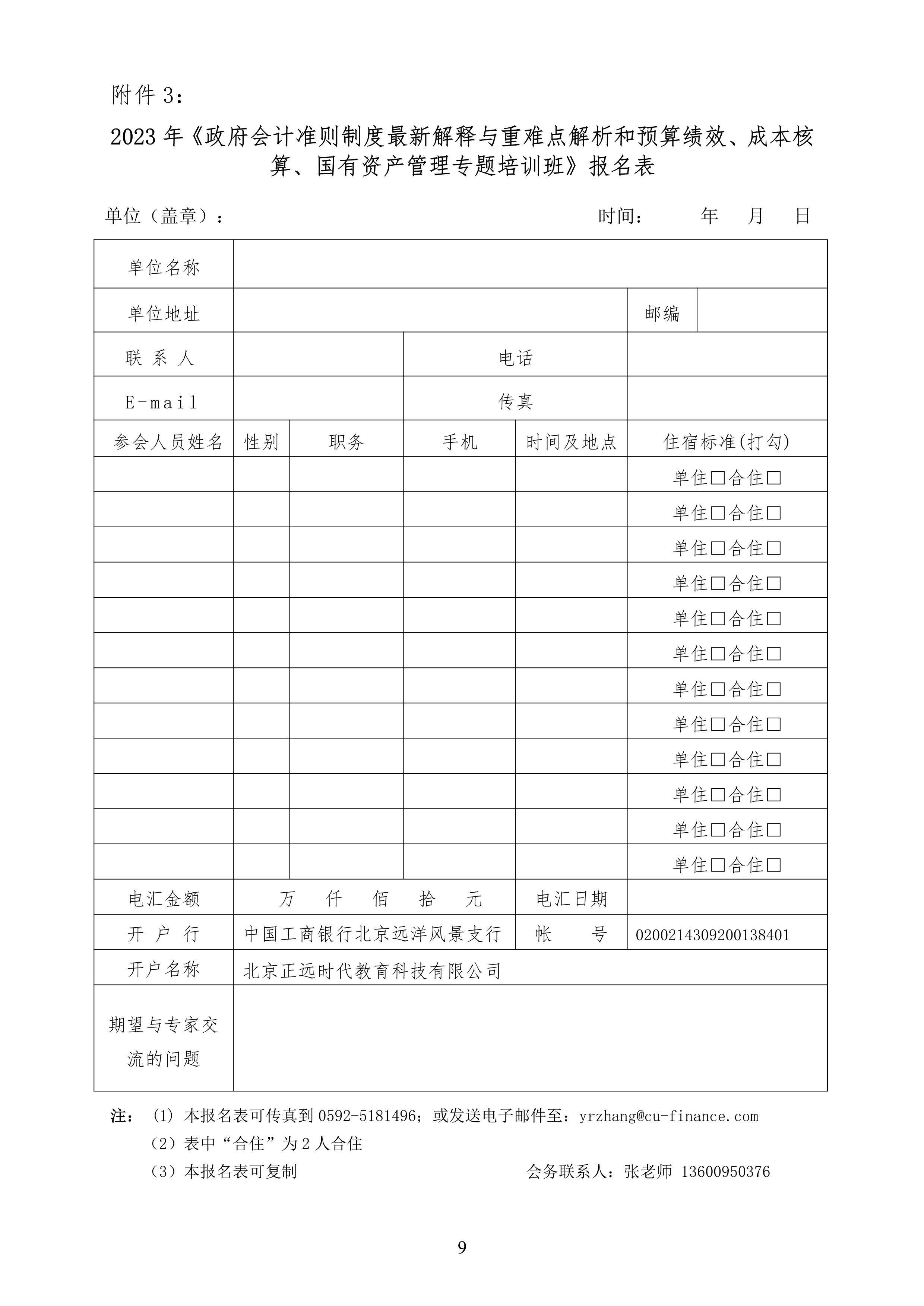附件:2023年《政府會(huì)計(jì)準(zhǔn)則制度最新解釋與重難點(diǎn)解析和預(yù)算績(jī)效成本核算國(guó)有資產(chǎn)管理專題培訓(xùn)班》報(bào)名表