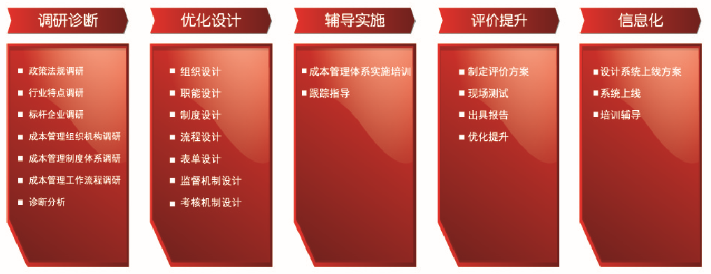 華夏經(jīng)緯運(yùn)用本公司前瞻性開展的相關(guān)研究成果及國(guó)際先進(jìn)成本管理方法、工具,結(jié)合行業(yè)最佳成本管理實(shí)踐,按照“成本預(yù)測(cè)、成本決策、成本計(jì)劃、成本控制、成本核算、成本分析、成本考核”七個(gè)環(huán)節(jié),對(duì)企業(yè)的成本管理現(xiàn)狀進(jìn)行全面診斷,為企業(yè)建立健全全面成本管理體系,提高成本管理水平,增強(qiáng)企業(yè)競(jìng)爭(zhēng)力。