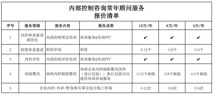 華夏經(jīng)緯財務咨詢(廈門)有限公司(簡稱“華夏經(jīng)緯”)從事內(nèi)部控制咨詢10余年,在內(nèi)部控制咨詢領域積累了豐富的經(jīng)驗。隨著市場經(jīng)濟不斷發(fā)展以及監(jiān)管機制的不斷完善,客戶企業(yè)對風險管理、內(nèi)部控制咨詢需求也在發(fā)生較大變化,以及現(xiàn)階段客戶企業(yè)對于內(nèi)部控制及風險管理咨詢個性化需求越發(fā)明顯,我司旨在為客戶提供最具價值的咨詢服務,推出“內(nèi)部控制咨詢常年顧問服務”。常年顧問服務報價及咨詢內(nèi)容詳見下表列示,歡迎各新老企業(yè)、事業(yè)單位客戶來電詳詢,熱線電話:0592—5181468,18250763753。