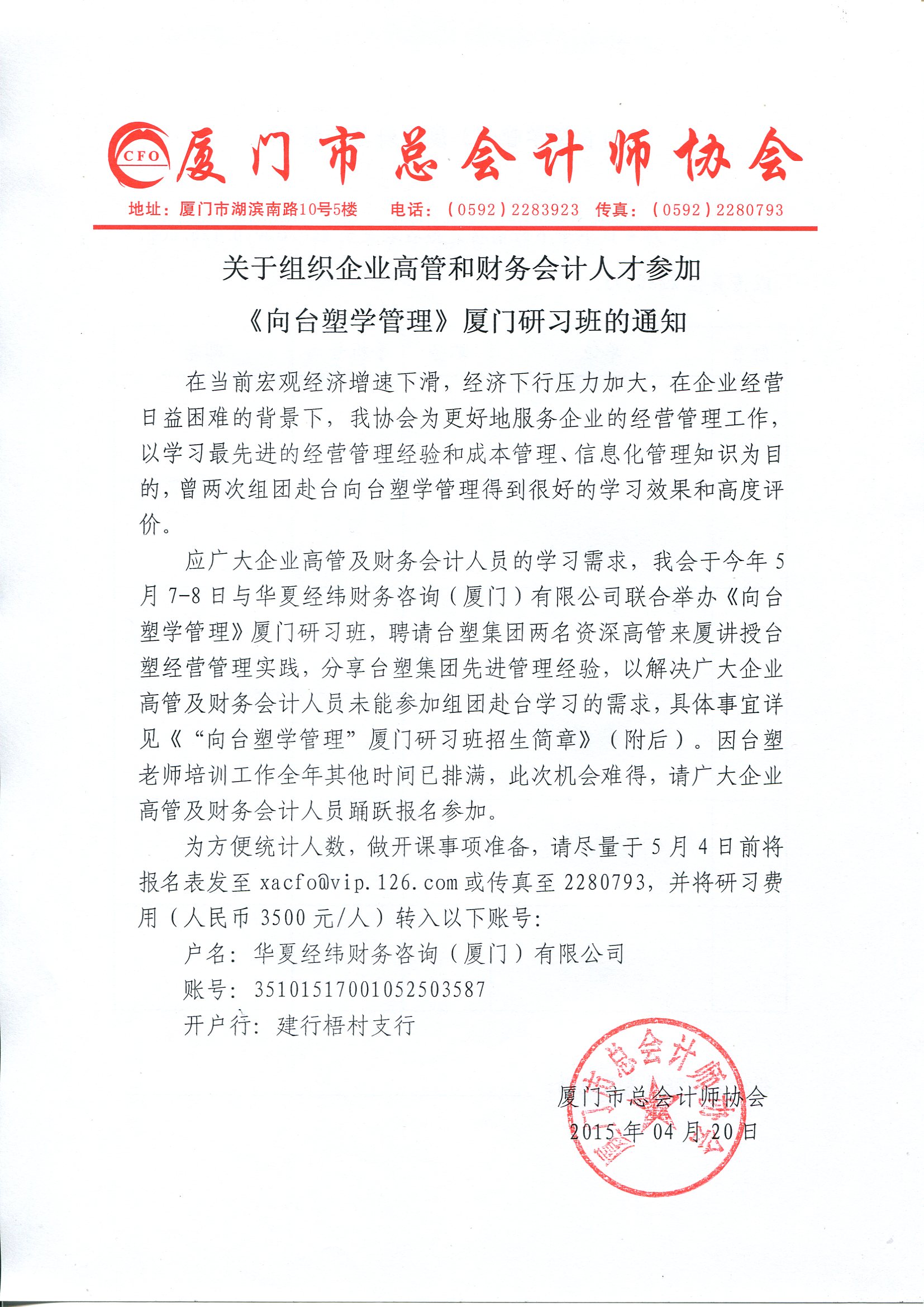 關于組織企業(yè)高管和財務會計人才參加《向臺塑學管理》廈門研習班的通知