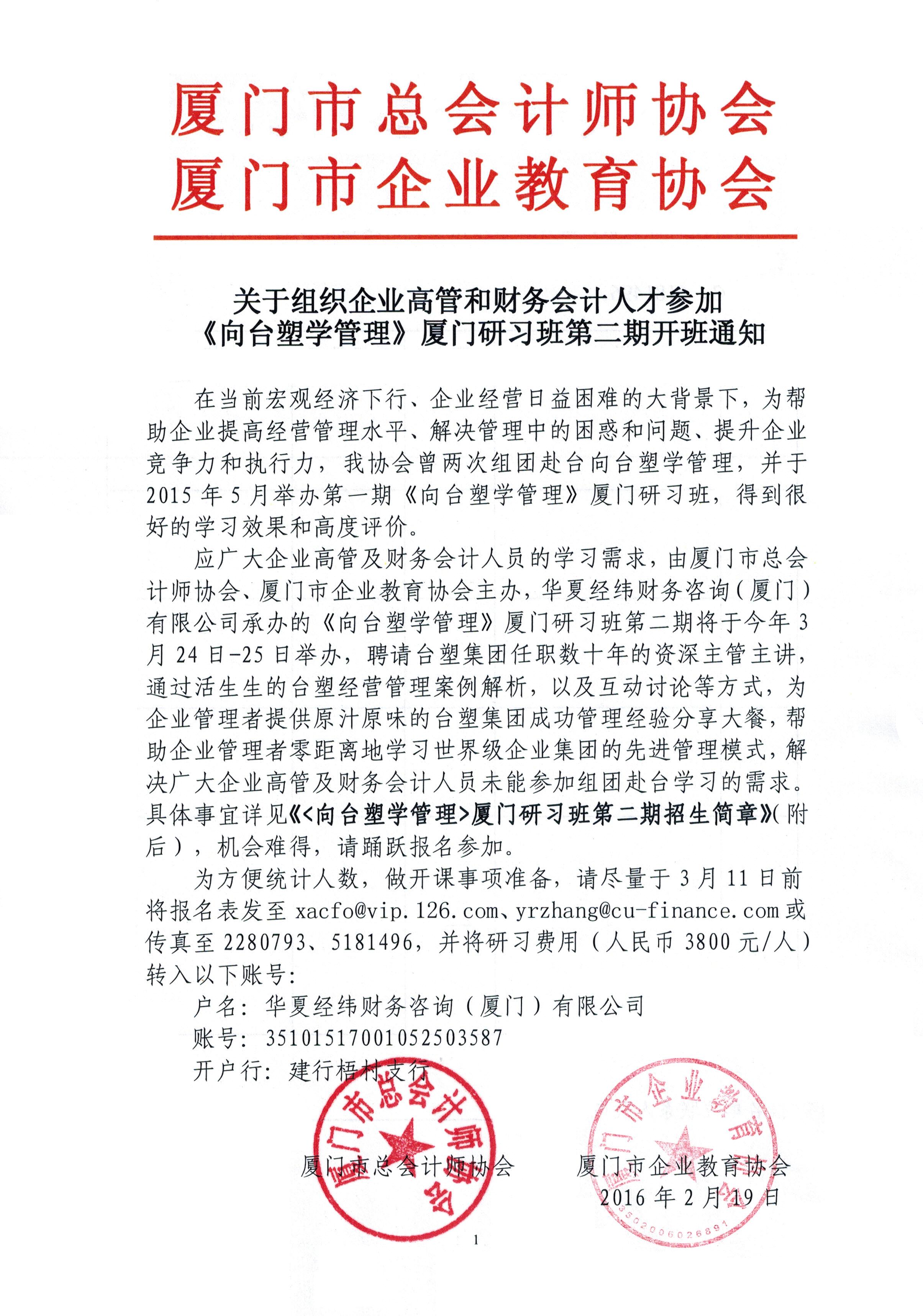 關(guān)于組織企業(yè)高管和財務(wù)會計人才參加《向臺塑學管理》廈門研習班第二期的通知
